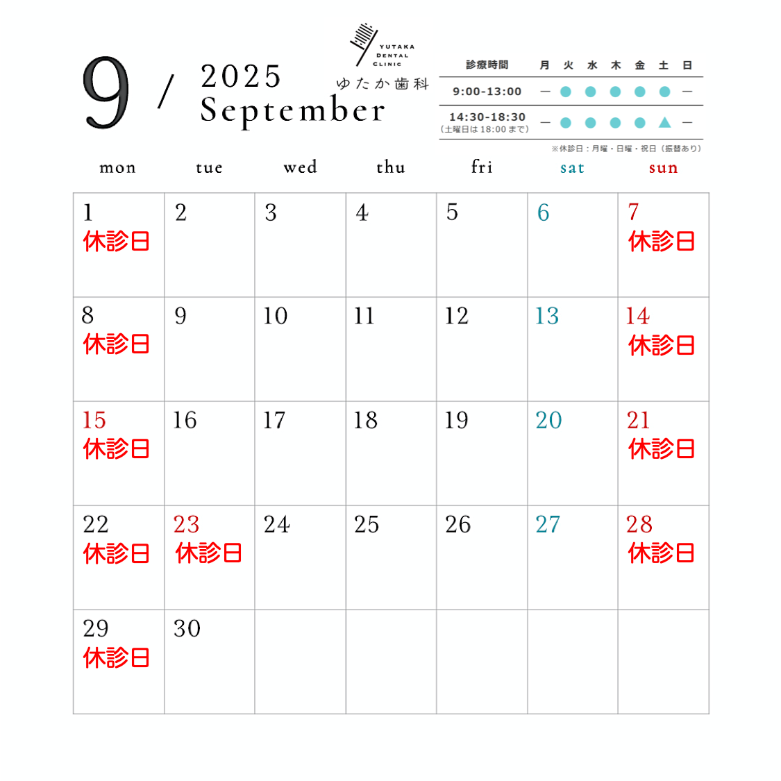 9月は、23日(火)が祝日のためお休みをいただいております。